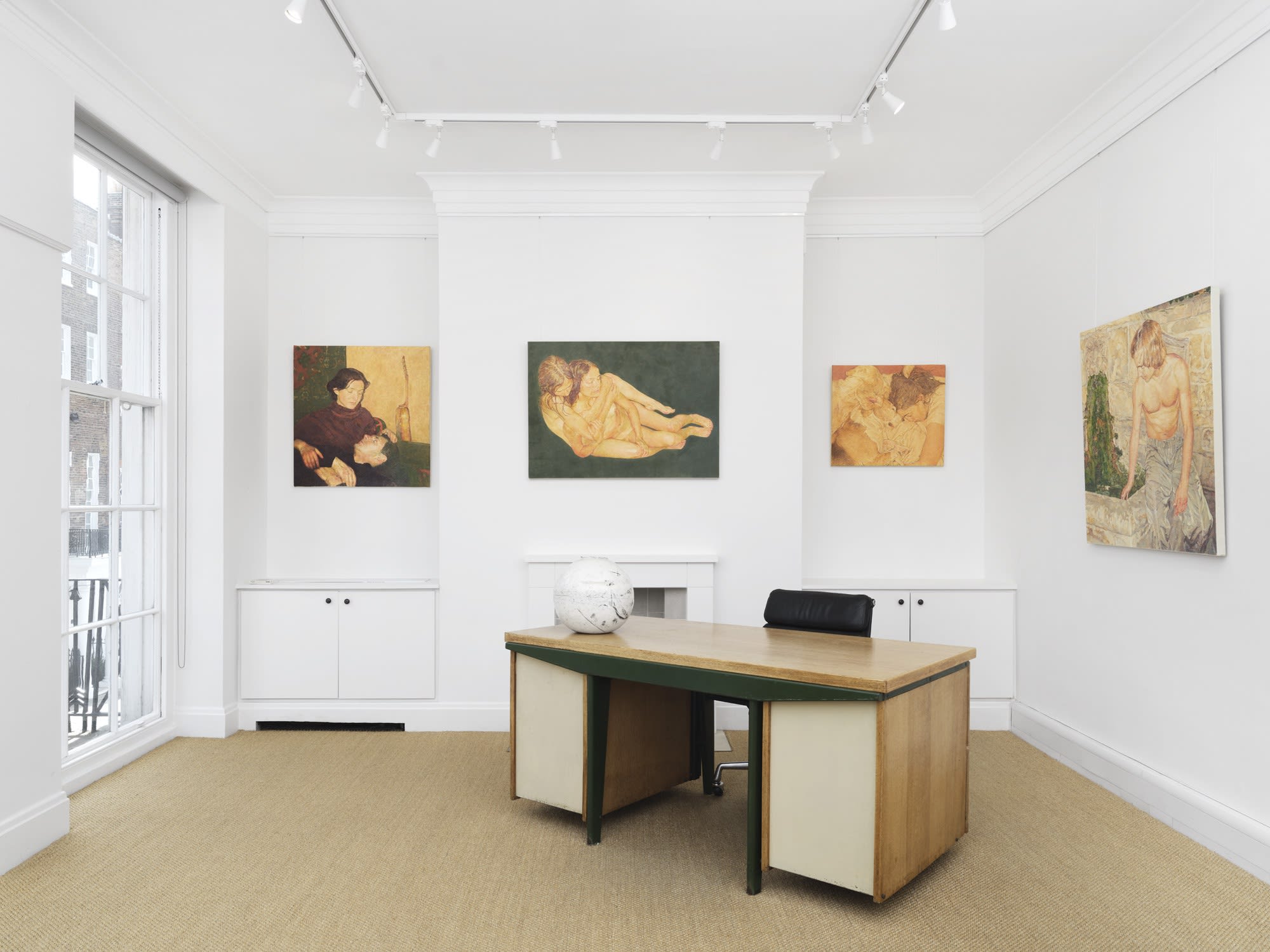 Pierre Bonnard wrote that the disposition of all painters is 'to examine the inner lives of human beings.' Sergey Kononov's recent paintings take on these words wholeheartedly. The seven paintings draw back the curtain to reveal intimate views of friendships cast in moments of repose, affection or contemplation. Kononov paints only what he sees, borrowing Gustav Courbet's manifesto of painting as a 'negation of the ideal' where reality is mirrored in every brushstroke.But behind each painting is an ecology of diminutive marks, like pixels on a monitor screen, his pointillist method favouring subtle obfuscation over exact replication. He attends to every strand of hair or fold of fabric, yet always allows more loosely fused details to find their way in, like the white of a primer or the mottled texture of canvas. In some, Kononov removes the background all together rendering his subjects in swathes of flat colour, the effect pronouncing his figures in a haloed glow. In others, his protagonists fuse with their surroundings, the ripples of trousers blending with the limestone brickwork behind, or a dog camouflaged with the unkempt bed sheets it's lying on.Anachronistic in their familiarity with canonical painters of the past, Kononov's compositions concoct an interlacing of many artistic movements into one, with an accuracy for painting skin to Édouard Manet and the muted dexterity for depicting clothing which recalls Berthe Morisot. Yet for all the reminiscences they conjure, each painting is an insight into companions who are dear to him and who populate his everyday life. They are painted from quick snapshots he takes on his camera before they're scaled up to canvas. He rarely loses sight of the instancy transmitted from the original photograph, their appearance in certain angles like pencil studies on cartridge paper. Across three paintings, Kononov affixes paper to the canvas with the help of a restorer, fusing the two surfaces seamlessly, the effect drawing to mind the tea-stained hue of the foxing on book pages as they age.In 'Companions' none of his muses court the viewer; they are either posed with their eyes closed, or looking longingly into the eyes of a lover. The atmosphere each painting emits is blemished with apprehension, as compositions jolt through shifting states of tension, like film stills on pause. The abiding tone is yellow ochre, just like that which Lucien Freud adoringly used in his portraits of Caroline Blackwood. Freud wrote that 'the simplest human gestures tell stories', which Kononov vouches for too, while his subjects are contorted, or hugging, or playing, in positions portrayed earnestly and without contrivance.- Ted Targett -